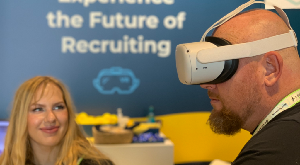 Deshalb haben wir es uns nicht nehmen lassen, kürzlich an unserem Stand auf der STAFFINGPro-Messe VR-Brillen auszulegen und Interessierten alles darüber zu erzählen. Dies verlief super erfolgreich! Direkt ausprobiert, haben unsere VR-Brillen zahlreiche Besucher*innen in Staunen und Begeisterung versetzt. Auch jenseits der Testenden erreichten uns interessierte und neugierige Blicke aus allen Richtungen. Die Nutzer*innen bekamen das jedoch gar nicht mit, so vertieft waren sie in ihre VR-Experience. Im Flair von „Bye bye, verregnetes Deutschland – hallo, Karibik!“ – denn die Teilnehmenden schalteten sich besonders gern in tropische Gebiete mit grünen Palmen und traumhaften Stränden – und vergaßen dabei alles um sich herum.