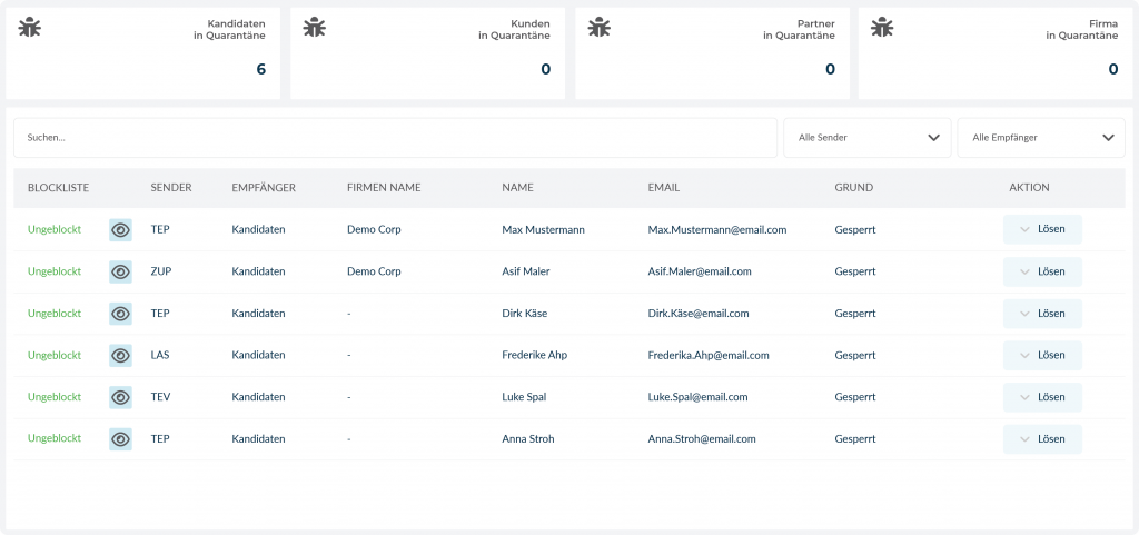 Mit SIPMail landen fehlerhafte eMail-Adressen automatisch in der Quarantäne – gebündelt und transparent. Sie sehen auf einen Blick Tippfehler, unzustellbare Empfänger und temporäre Zustellprobleme und entscheiden pro Adresse: korrigieren, freigeben oder entfernen.