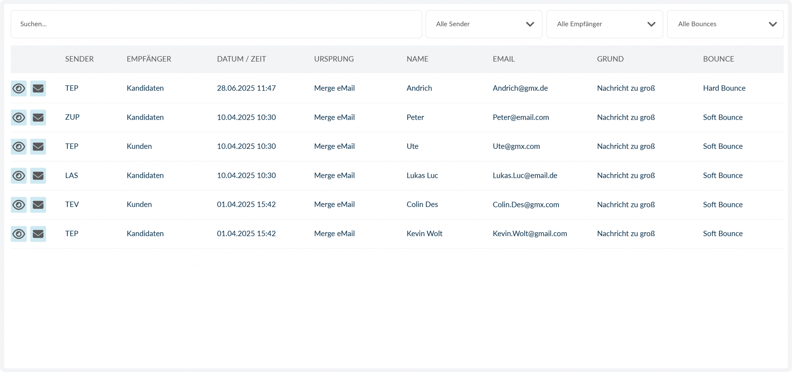Mit SIPMail sehen Sie sofort, welche eMails nicht zugestellt wurden – inkl. Status (Hard/Soft Bounce), Original-Fehlermeldung des Zielservers und Zeitpunkt. So identifizieren Sie Ursachen und können diese mit einem Klick korrigieren.